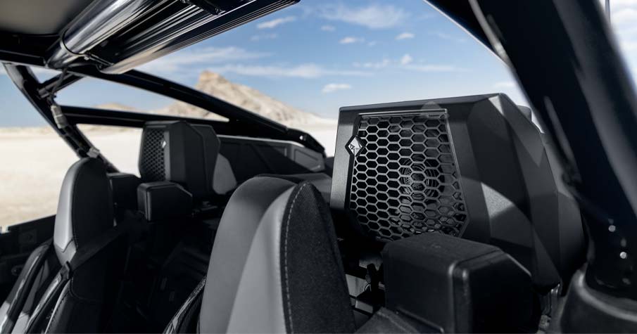- Sistema de audio Rockford Fosgate Stage 4 integrado y ajustado de fábrica con unidad fuente RIDE COMMAND. Incluye (1) amplificador digital de 1500 W y 8 canales, (2) tweeters de 1« y 100 W, (2) altavoces delanteros de 6,5» y 100 W, (2) altavoces traseros coaxiales de 6,5« y 100 W, y (1) subwoofer de 10».
